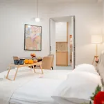 La pièce offre une vue sur le jardin et comprend une cuisine entièrement équipée avec une climatisation et un lave-linge.